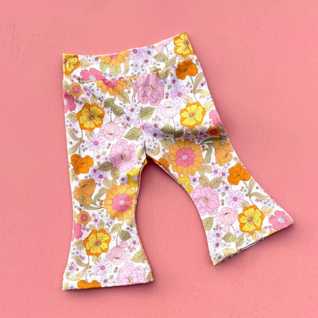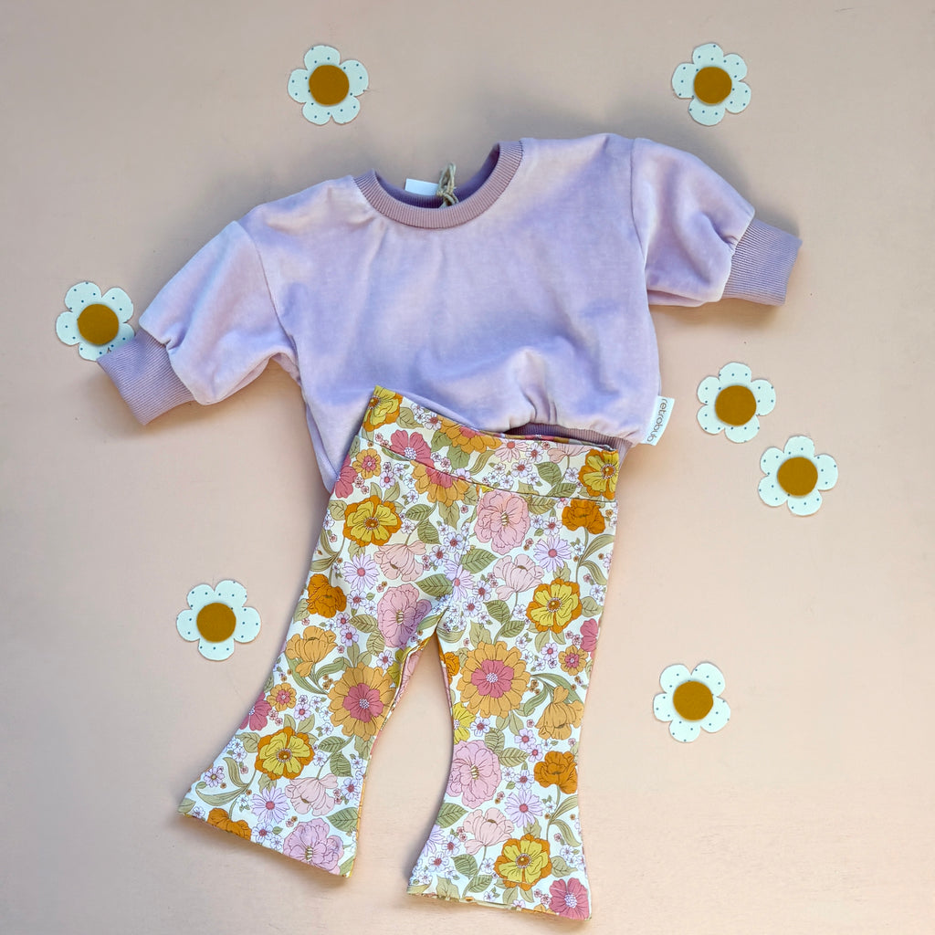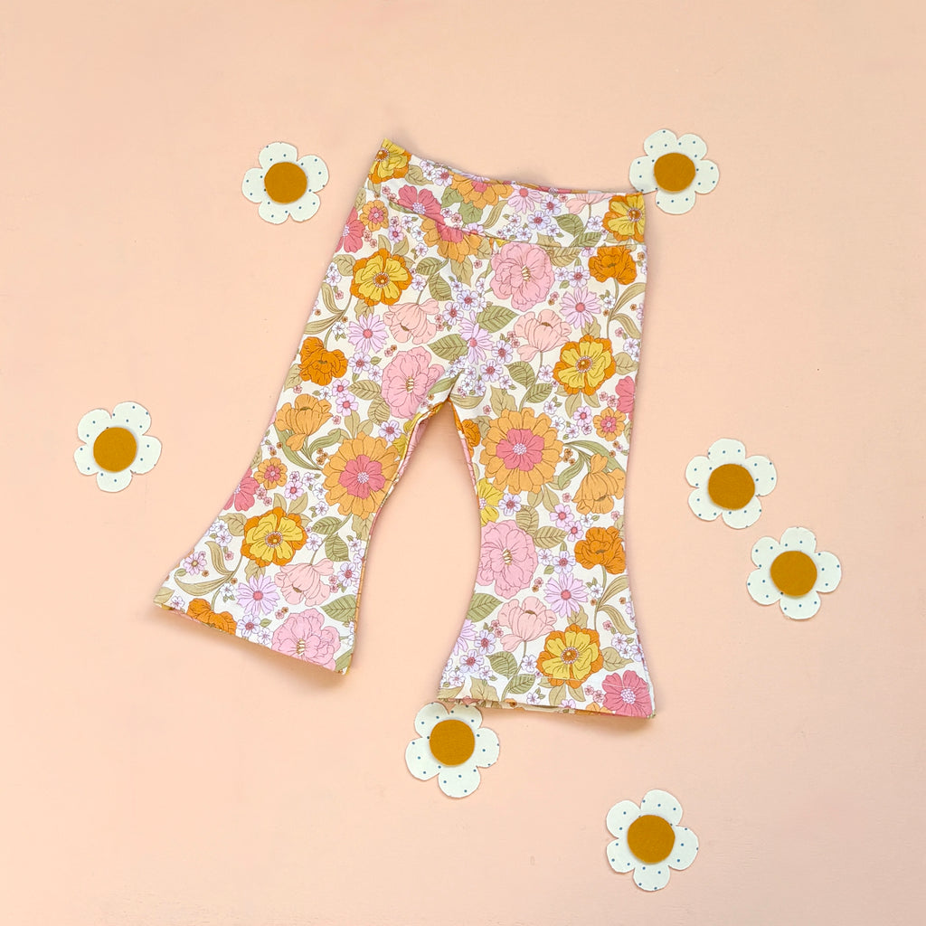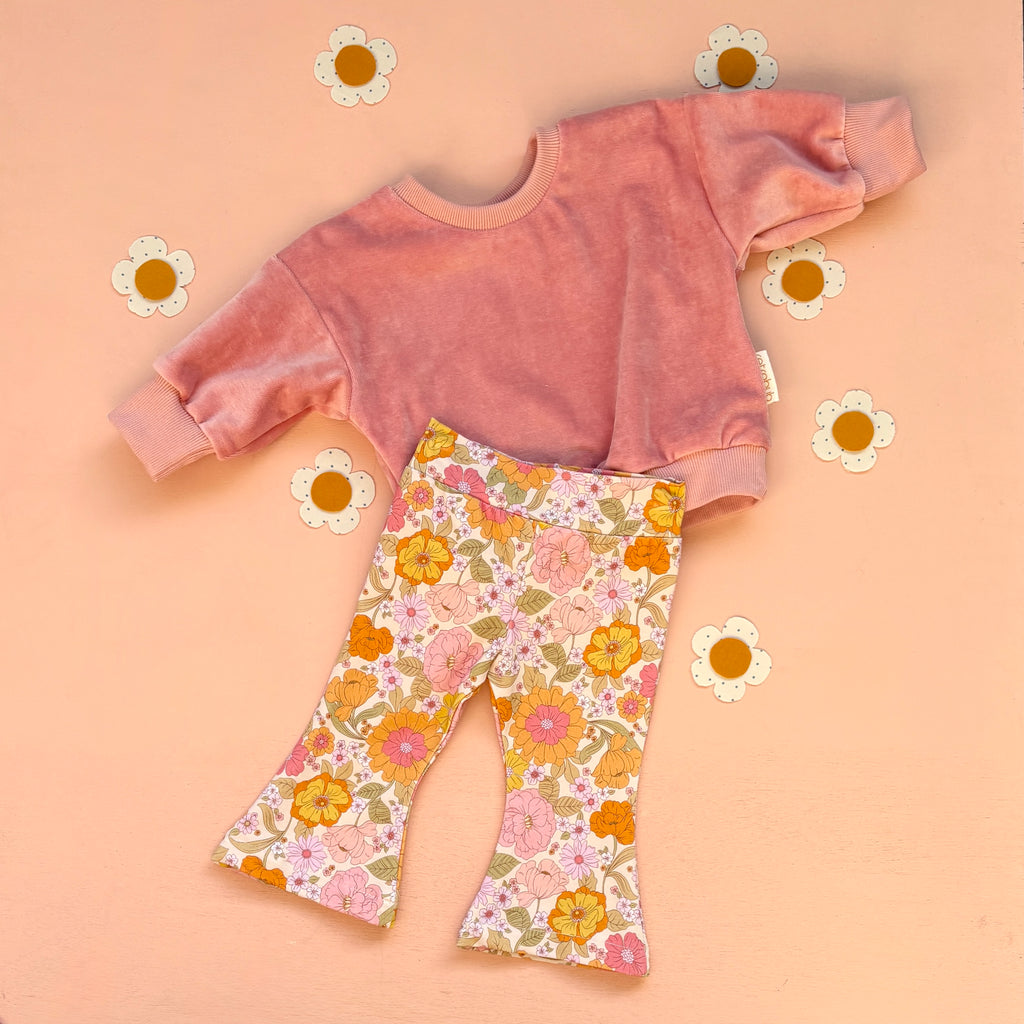 95% cotton 5% lycra stretchy fabric in a flare bell bottom style, these have a stretchy waistband the same as our leggings and are pull on/off. Gorgeous floral print with gelati colours of peachy pink , lilac and yellow. The colours in these match well with the peachy pink and lilac velour jumper, both sold separately , have a look at the photos to see the outfit