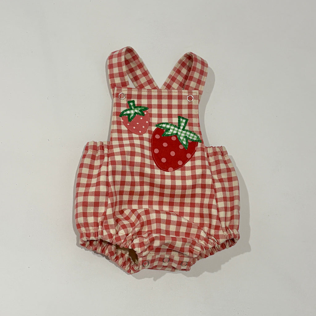 95% cotton 5% spandex romper in peachy pink gingham with two little strawberries sewn on the front bib. This style has encased elastic around the legs and across the back . Little bib front fastens with studs to the straps. The straps cross over at the back so they won't slip off little shoulders and they have a little extra length with another set of studs so you can adjust the length as the baby grows. Gusset opens completely with studs for easy nappy changes. Can be worn on its own or with a tshirt underneath - perfect for summer days. size 0000 newborn , size 000 0-3 months, size 00 3-6 months, size 0 6-12 months and size 1 12-18 months as a guide. Made in Australia ethically right her in our Melbourne studio