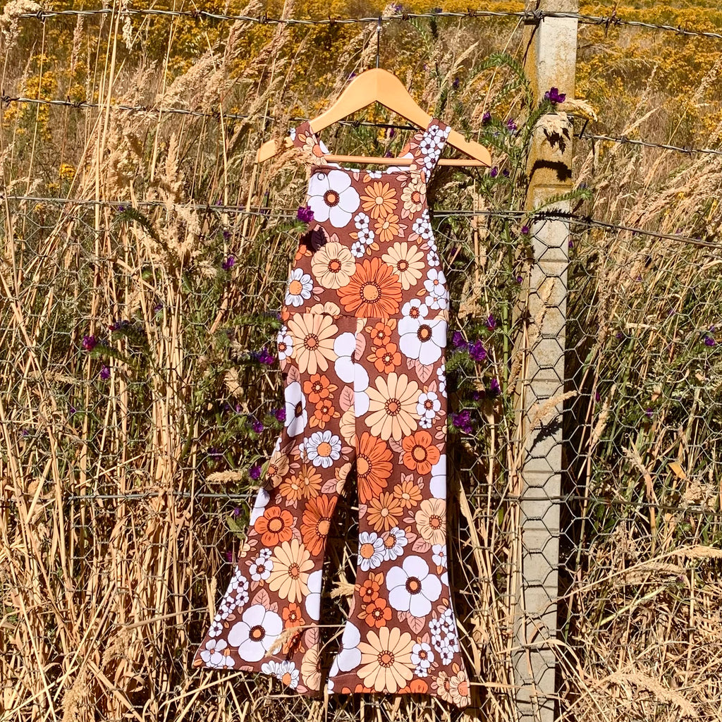 95% cotton 5% lycra stretch knit fabric bell bottom overalls. Straps have an extra set of studs so you can adjust the fit as the baby grows. This wanderer floral print is super 70's style with colours of brown , cream and peach