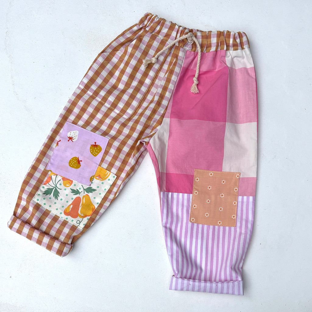 100% cotton pants in our new baggy, pop-on style. Front and back pockets for all the rocks and treasures and a few extra patches on the knees . Prints of gingham and stripes with strawberry and pears in the patches in colours of pink,yellow and lilac. Elastic waist with an adjustable chunky cotton rope tie so you can pull them in or let them out to fit but they are easy to get on and off. Baggy fit leg for comfy style , the leg has some extra length so you can roll up the hem for a cute look and then when the child grows a bit taller un-roll and get some more wear out of them. And the leg has been slightly tapered at the hem so that the little rolled up cuff will stay rolled up and it gives it that barrell leg look. Fun and perfect for play. Made in Melbourne Australia