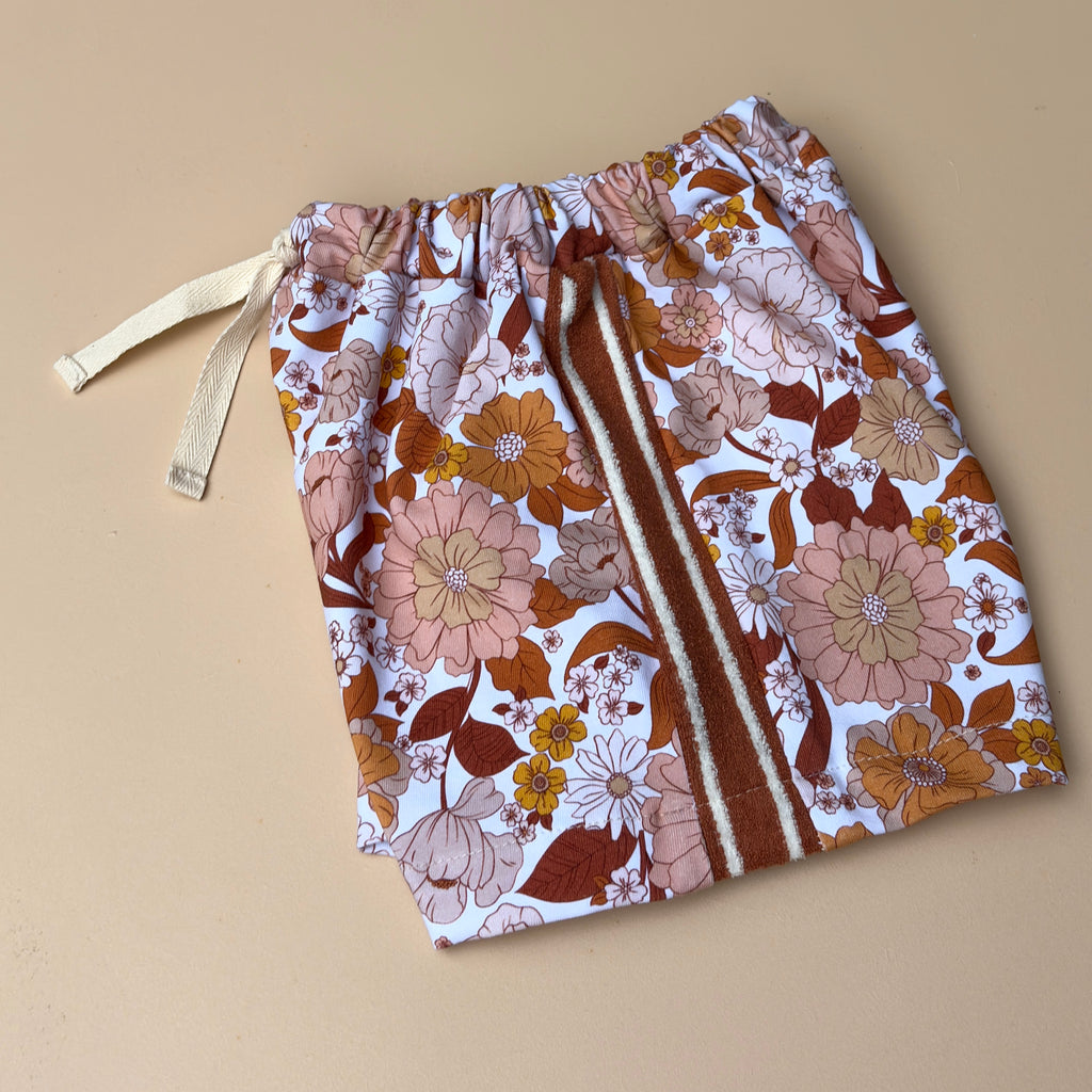 Cinnamon coloured floral stretch knit shorts, 95%cotton 5% Lycra with terry towelling stripes down the side. Beachy and sporty and fun for summer,  functional drawstring waist with elastic